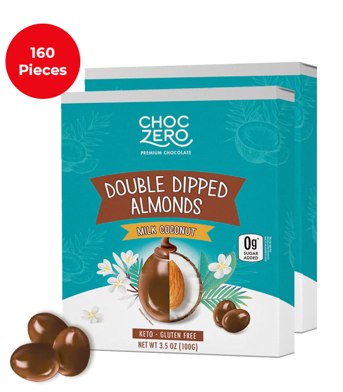 Keto chocolate almonds are delicious. That's why we took healthy roasted almonds and coated them in a sugar free coconut candy then covered them in a layer of delectable no sugar added milk chocolate. These are our double dipped almonds: never cocoa dusted and full of keto friendly joy!